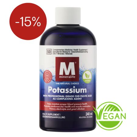 An advanced aqueous form of Potassium Ions (IsoIonic™)** in clear solution for quicker absorption than tablets or capsules which must first dissolve in the digestive system before being absorbed. Patented, clinically tested professional grade CHD-Fulvic Acid has been added to further increase absorption and enhance overall well-being as fulvic acid has natural anti-viral, anti-bacterial, anti-inflammatory, and detoxification properties.